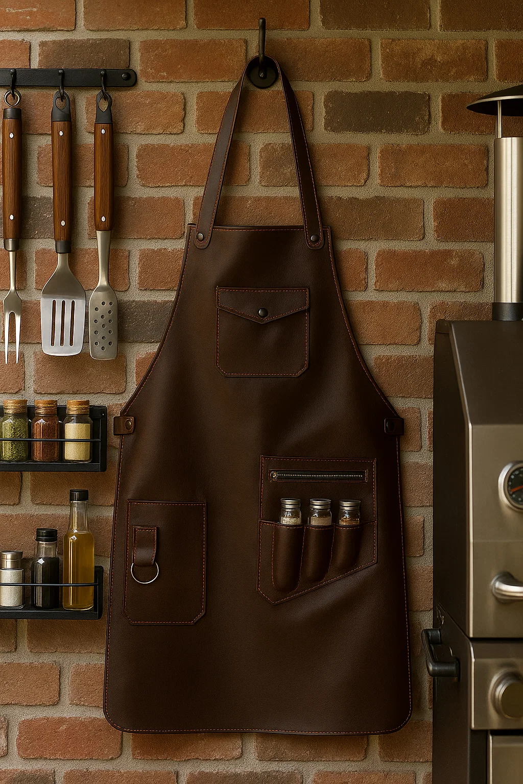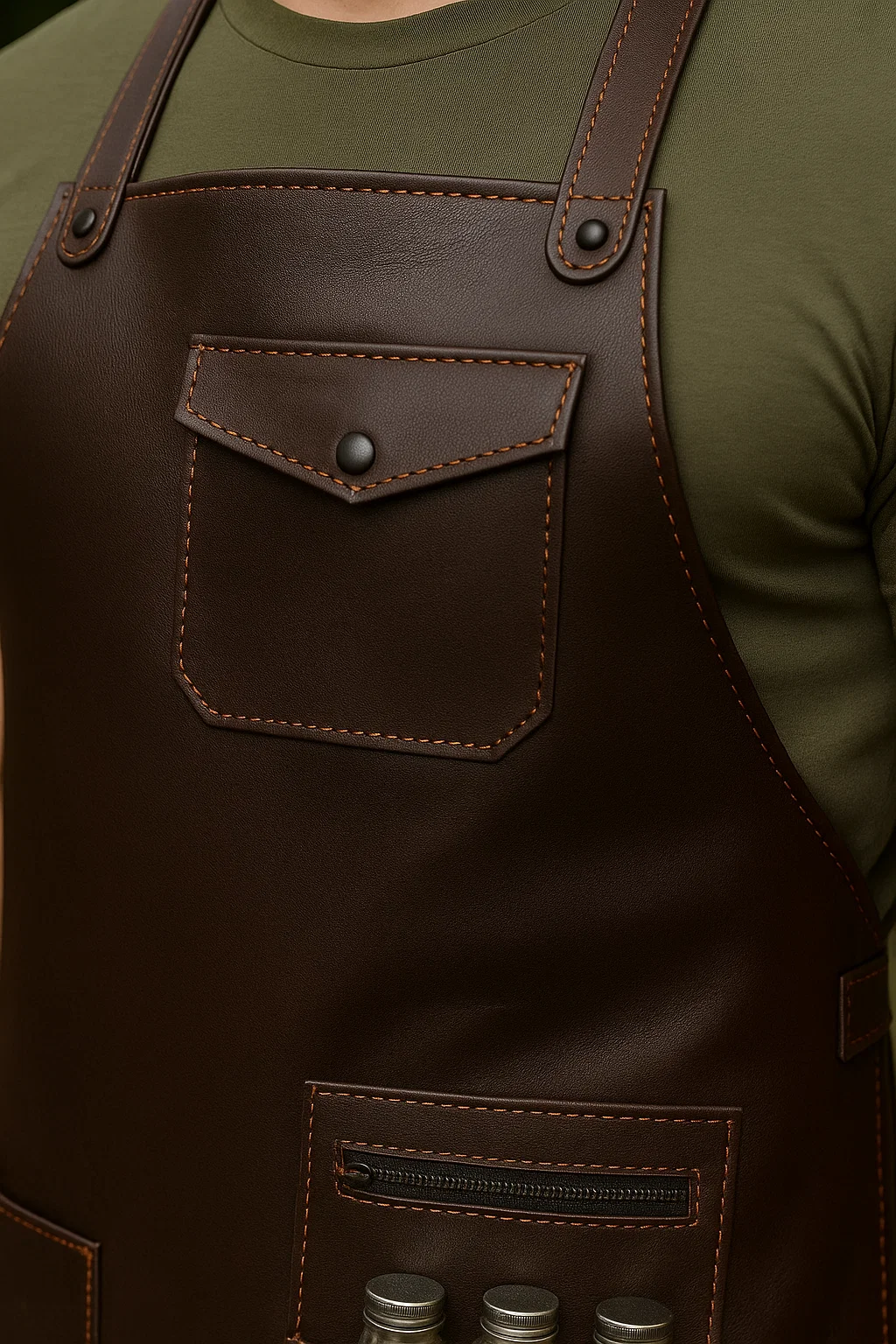 Crafted in a deep brown finish with highlighted stitching, it balances durability with sharp presentation. Whether you are managing long smokes or quick sears, this apron’s layout and construction streamline tasks while maintaining a clean professional look.