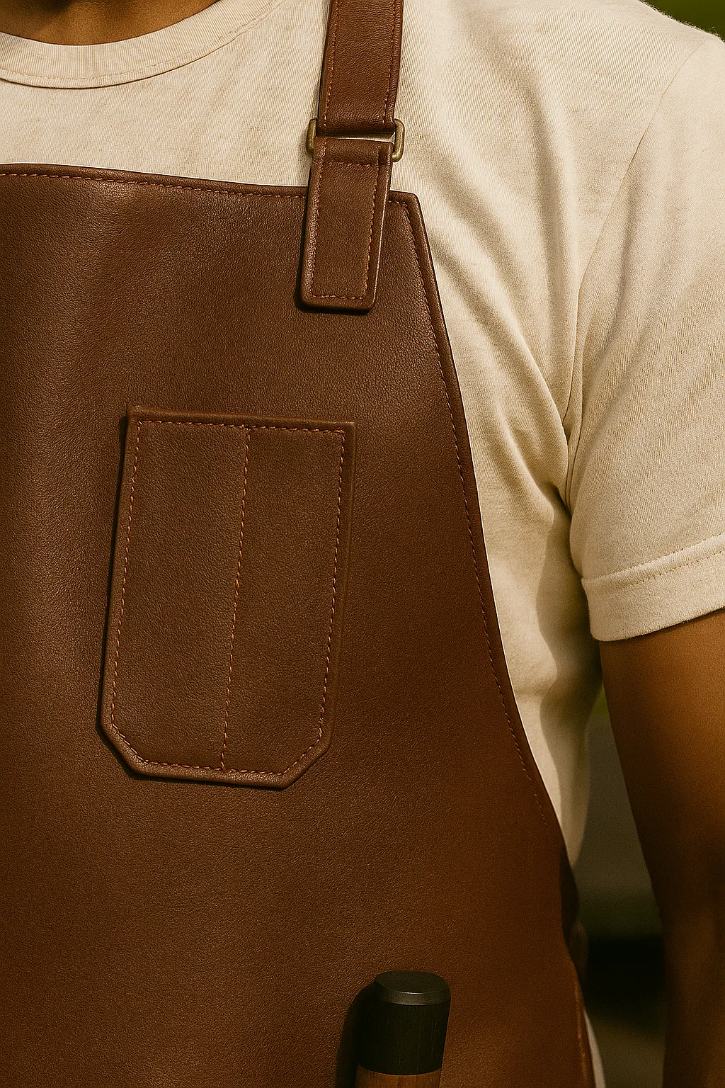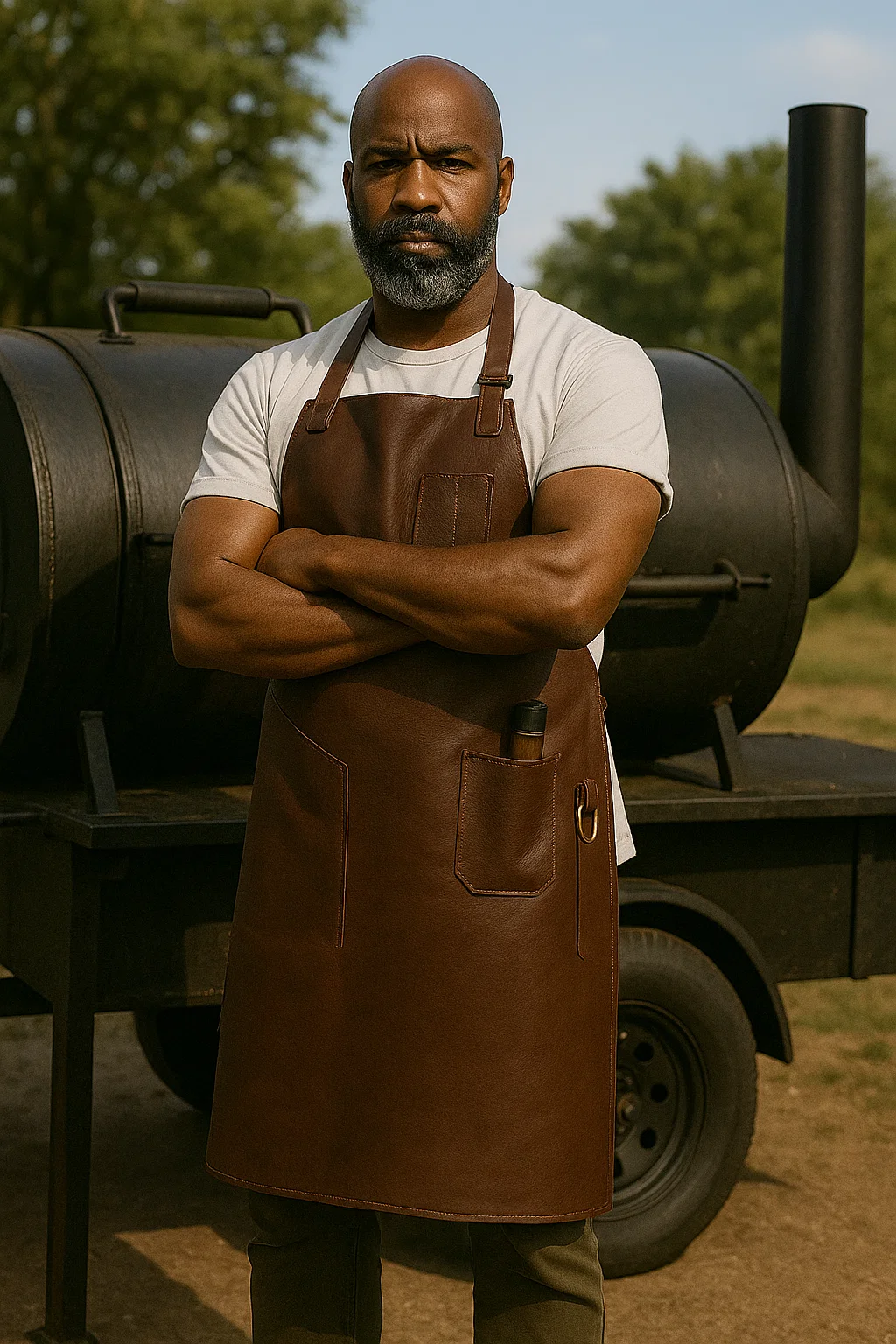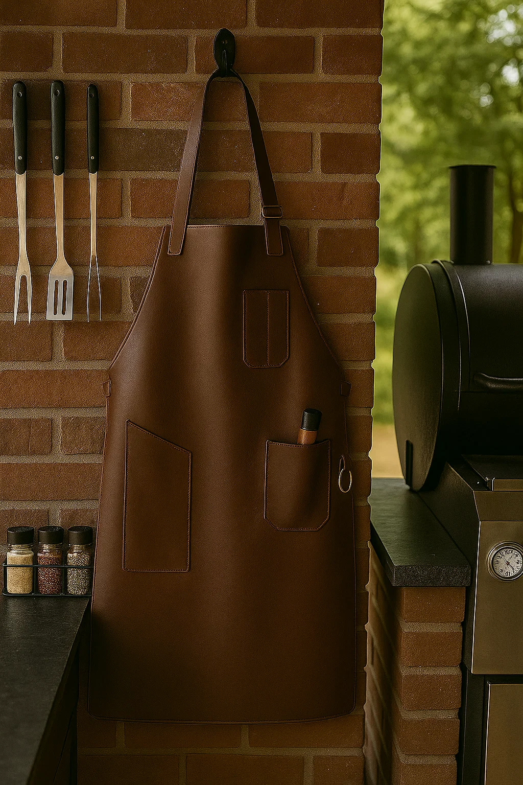 Made from full-grain chestnut brown leather, this apron combines structure with durability, resisting sagging even during long smoke sessions. Its precision-stitched seams reinforce stress zones, making it a reliable shield against sparks, grease, and heat. The smooth matte finish gives it a bold smokehouse aesthetic, pairing rugged strength with professional presentation.