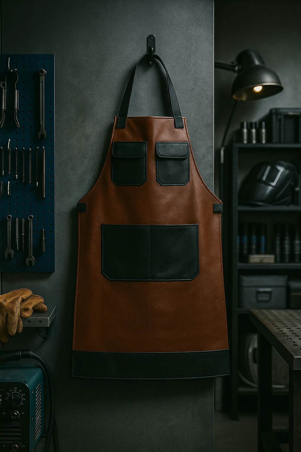 Made entirely from heavy leather, this apron offers strong resistance to spatter, abrasion, and direct heat. Reinforced hems and contrasting black panels provide extra strength where it is most needed. The extended coverage protects both torso and upper legs, while riveted straps distribute weight evenly to ensure comfort during long hours at the station.
