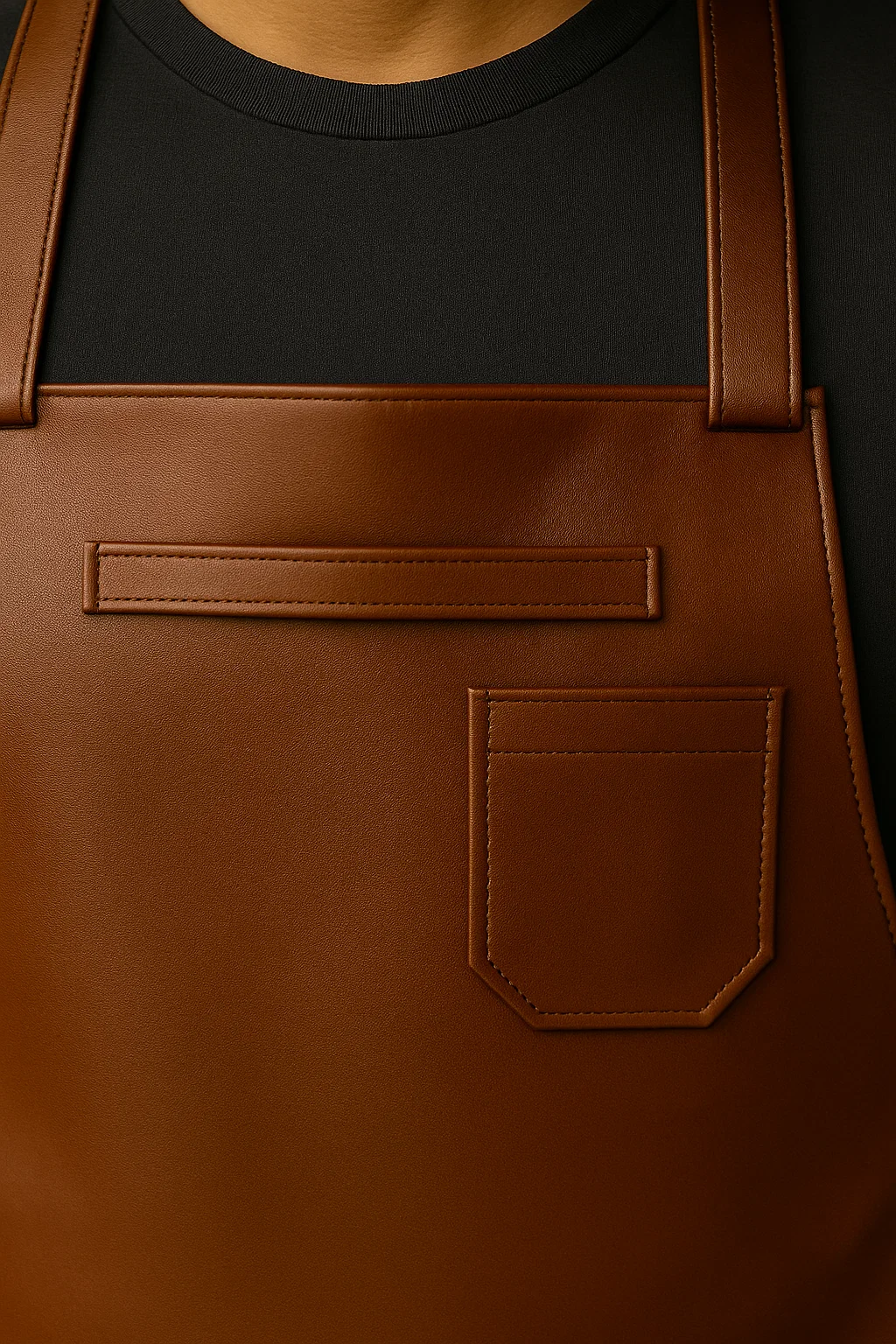 Its design features a chest pocket for quick access, dual waist compartments for organizing tools, and a sturdy side ring to hold accessories. The adjustable straps ensure comfort during extended shifts, while the structured leather adds to the apron’s professional presence.