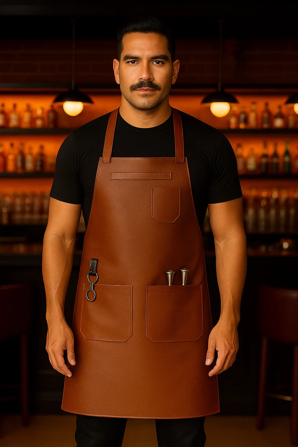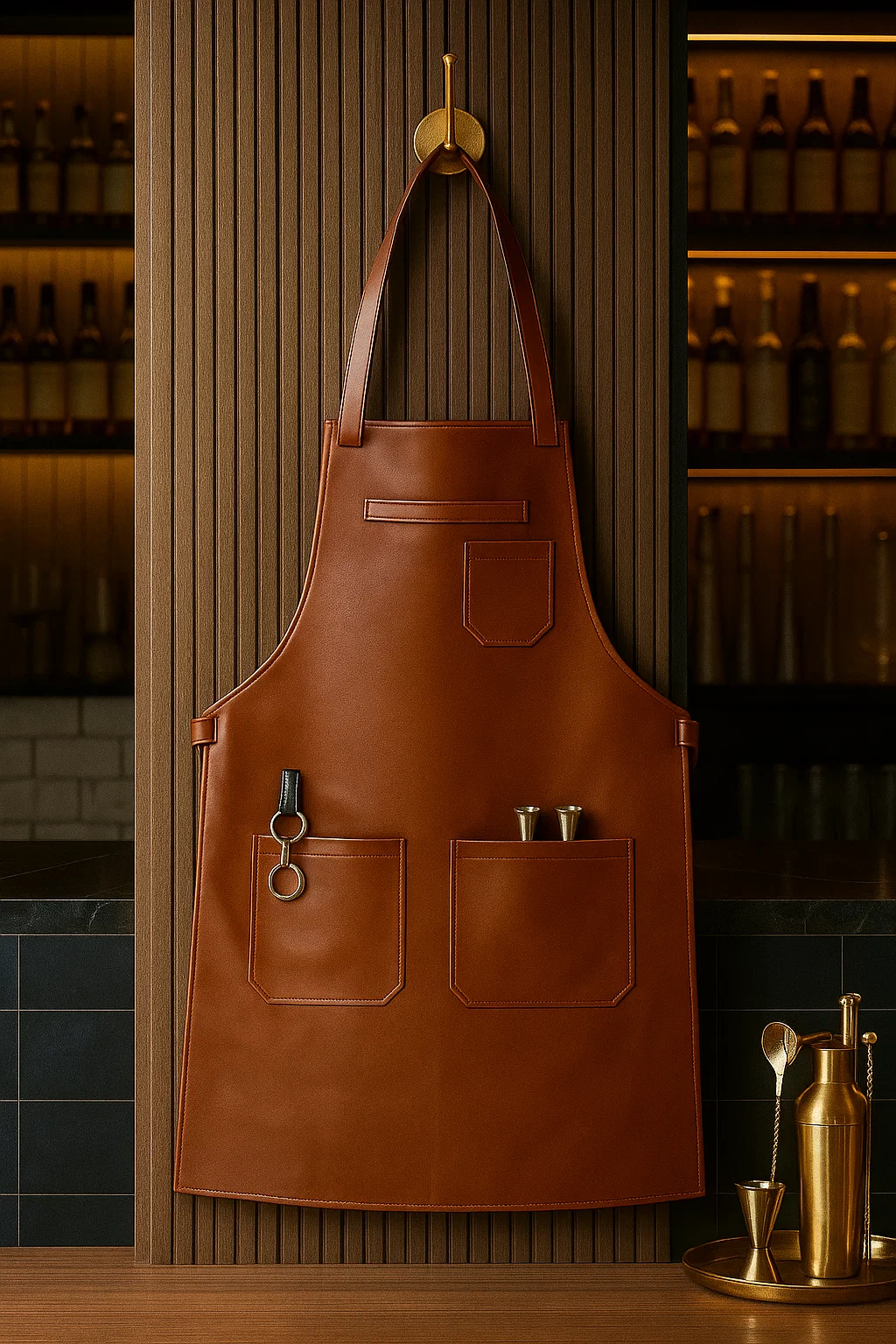 The Jiggerroot bar apron is crafted for bartenders who value both precision and resilience in their workwear. Made from 100% genuine cow leather, it offers a rich brown finish with reinforced stitching to handle long hours behind the bar.