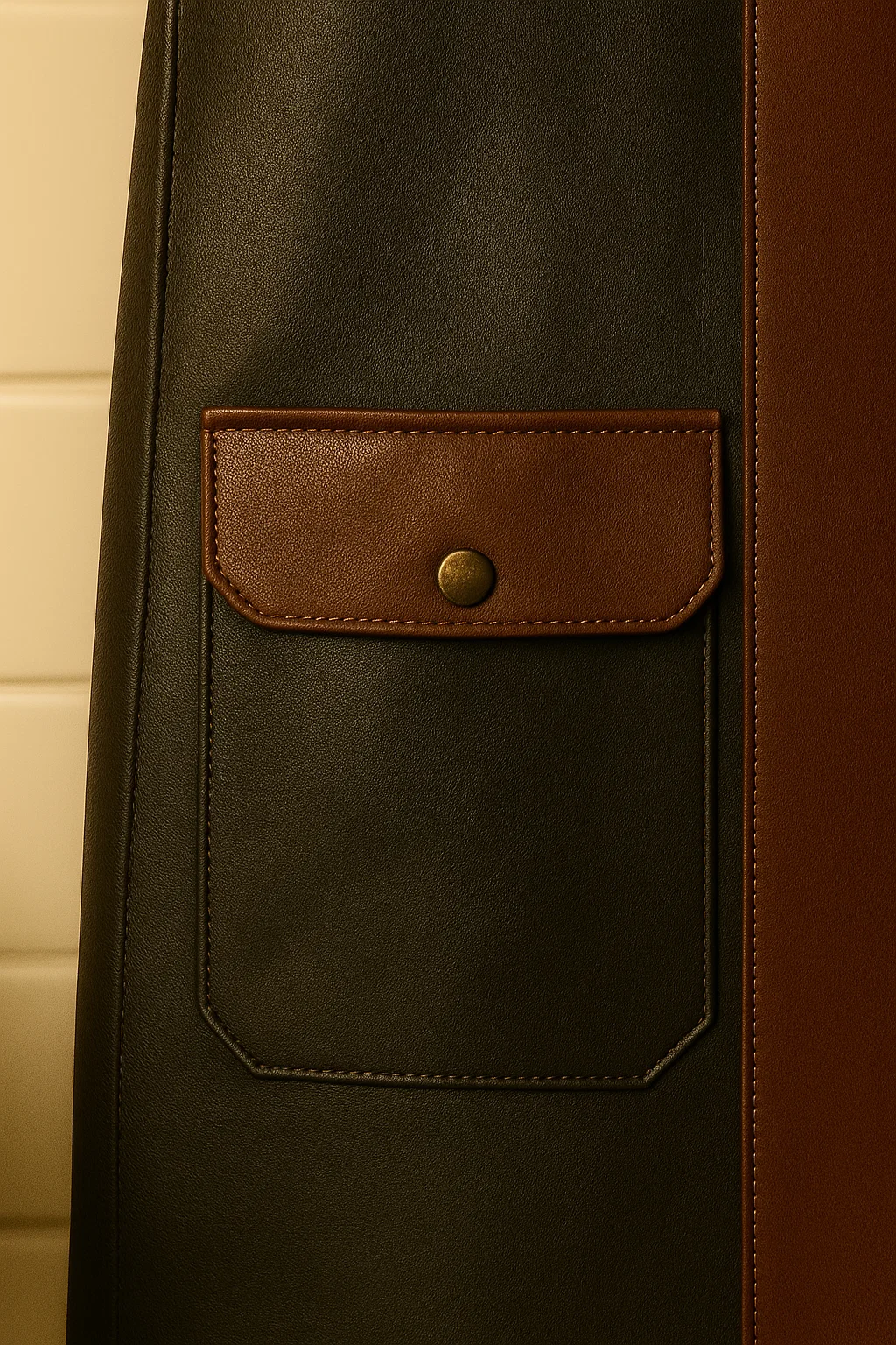 The Kitchenguard apron is designed for chefs who work in intense, high-heat kitchens. Its flame-resistant leather construction provides reliable shielding against sparks and heat exposure. The standout black-and-brown split panel with a central stripe makes it as visually sharp as it is functional.