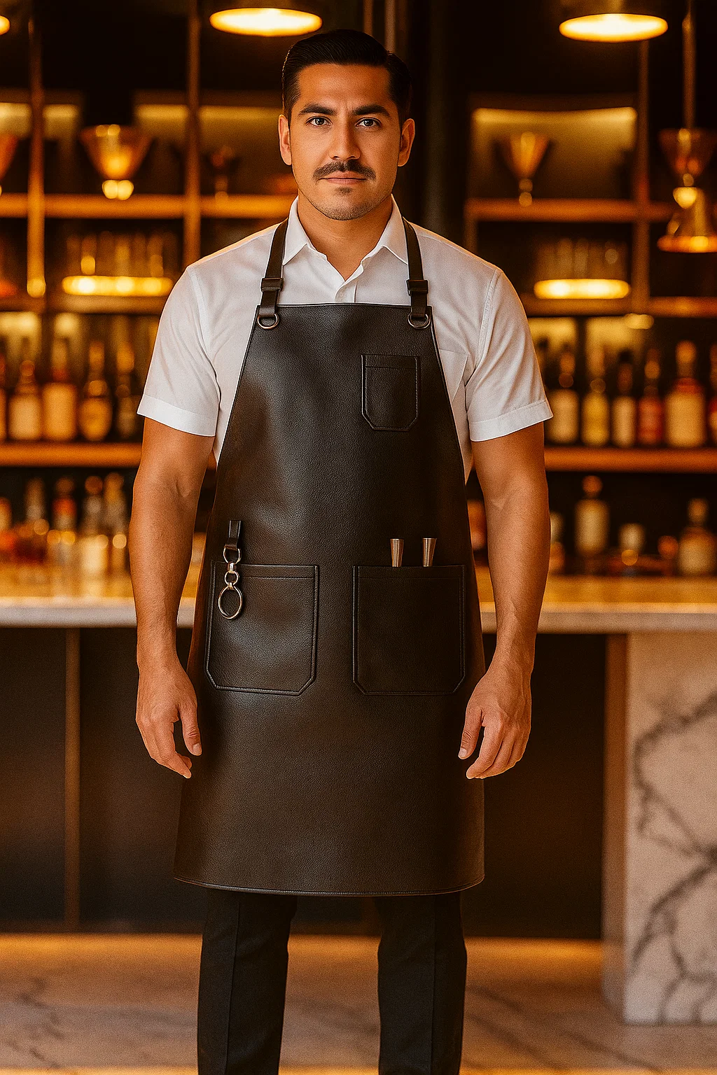 Designed for efficiency, the apron includes a chest pocket for quick notes or slim tools, dual waist pockets for barware essentials, and a metal utility ring for towels or accessories. Reinforced stitching and sturdy leather straps with metal loops provide lasting reliability during long shifts.