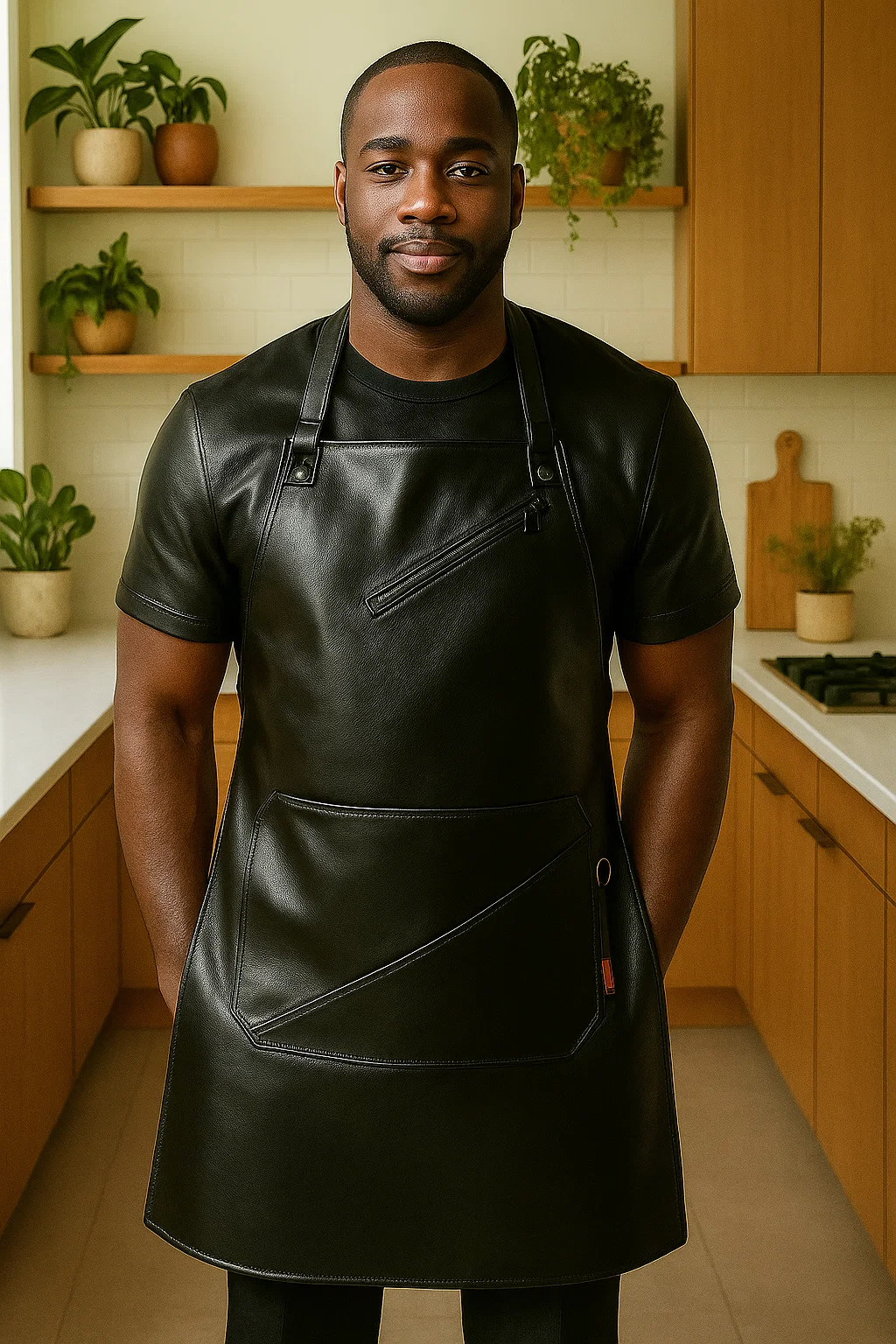 The Torchline apron is crafted for chefs who value function and visual precision. Its black leather surface is paired with bold angled lines, giving it a distinct identity while remaining practical for kitchen work.