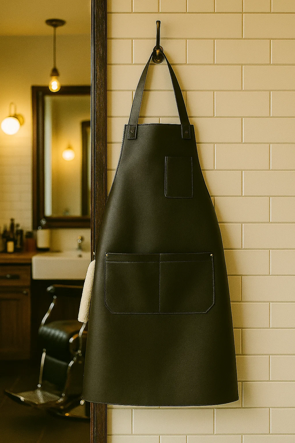 The trimdeck hairdresser apron offers a clean, minimalist design that blends utility with refined style. Made from black leather, it delivers durability and a sharp professional look suited for salon or studio use.